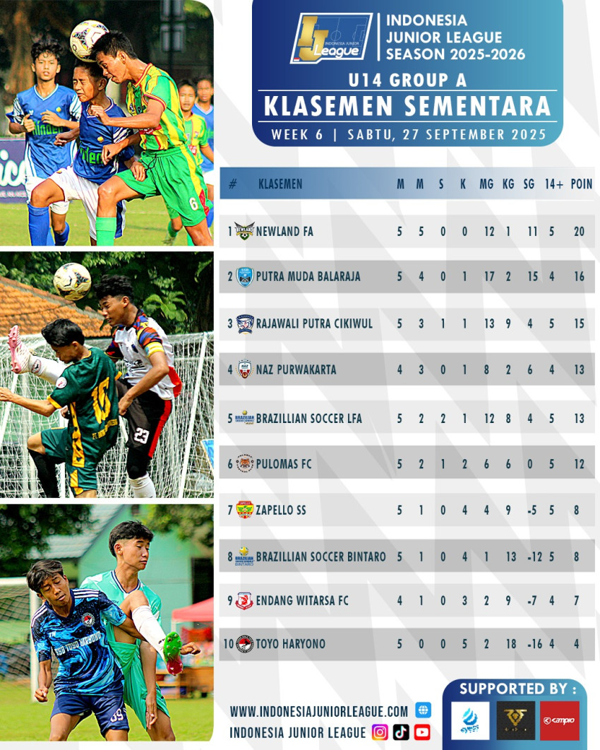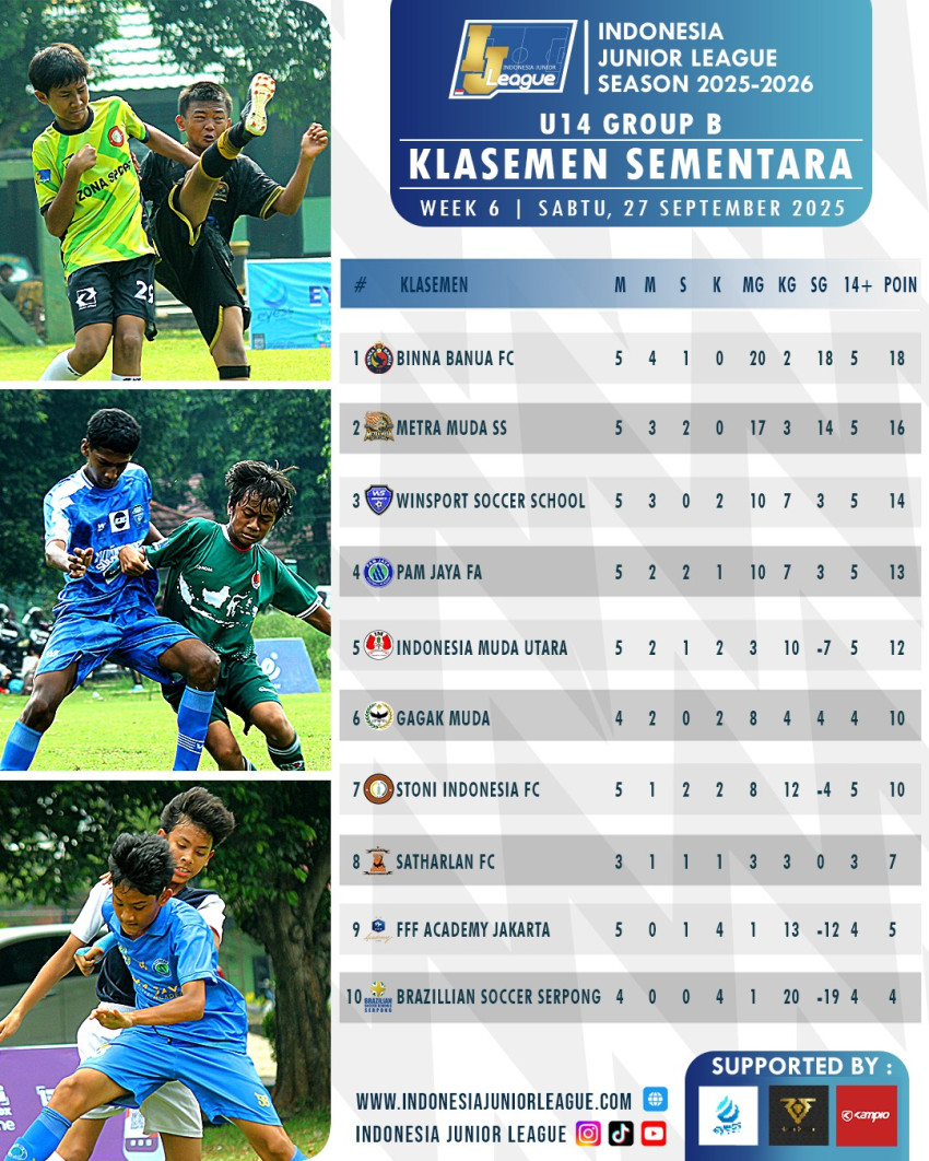 Pekan keenam Indonesia Junior League U-14 jadi gambaran semakin padatnya persaingan di tabel klasemen. Pertahankan 'kursi' seakan jadi harga yang tidak bisa ditawar lagi.